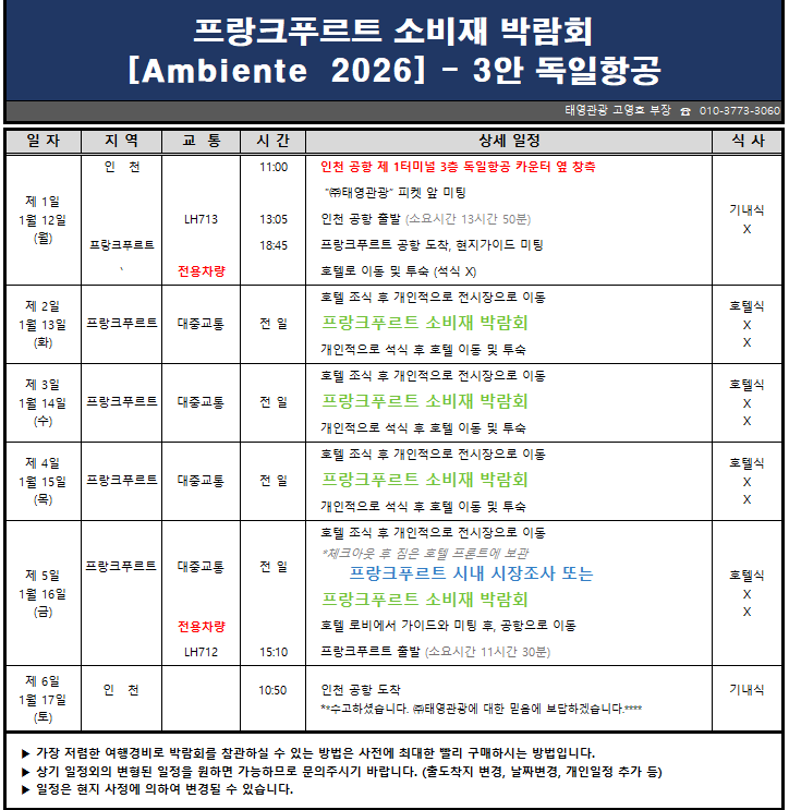 2. 여행일정표(또는 여행설명서)에는 여행일자별 여행지와 관광내용·교통수단·쇼핑횟수·숙박장소·식사 등 여행실시일정 및 여행사 제공 서비스 내용과 여행자 유의사항이 포함되어야 합니다.